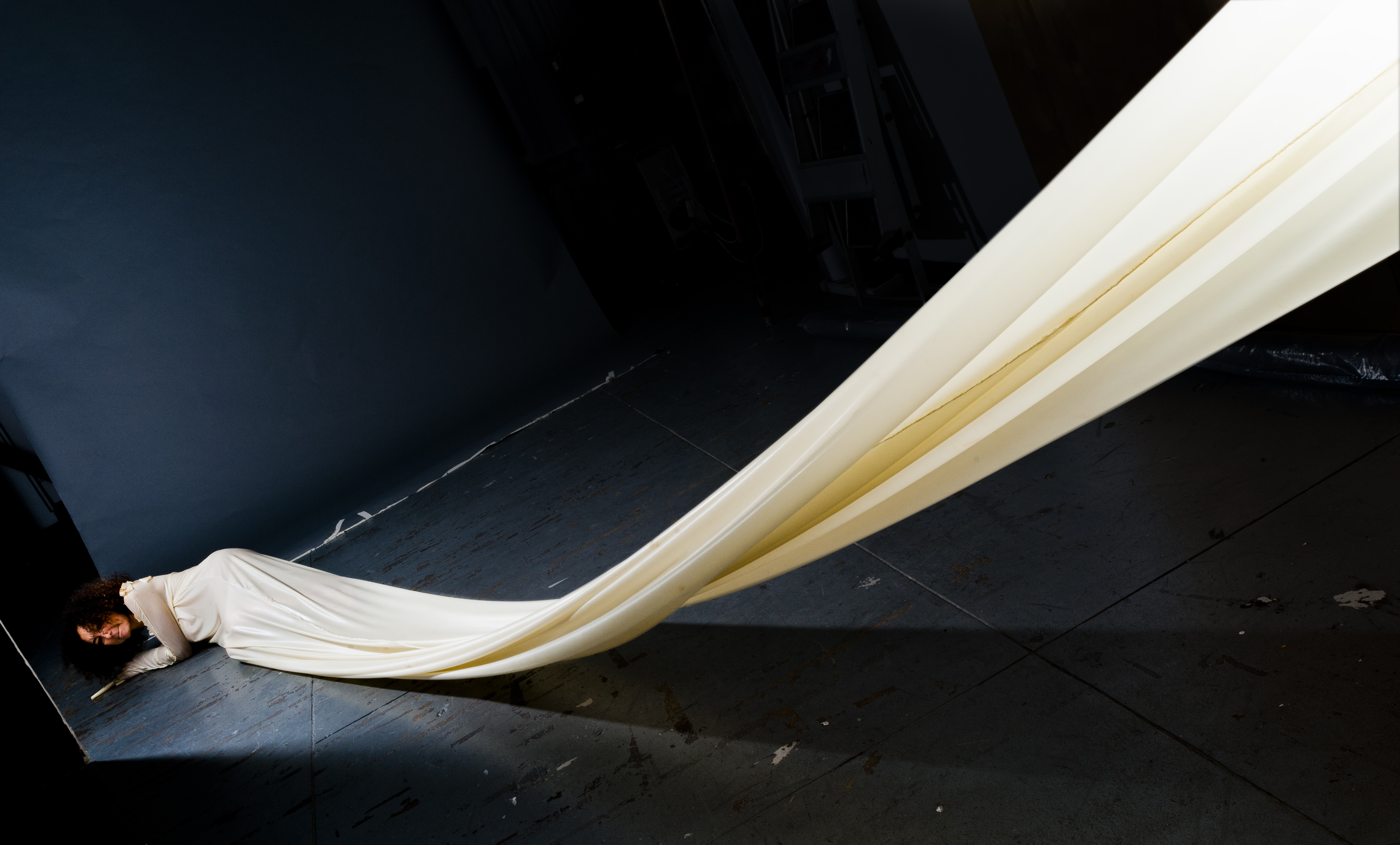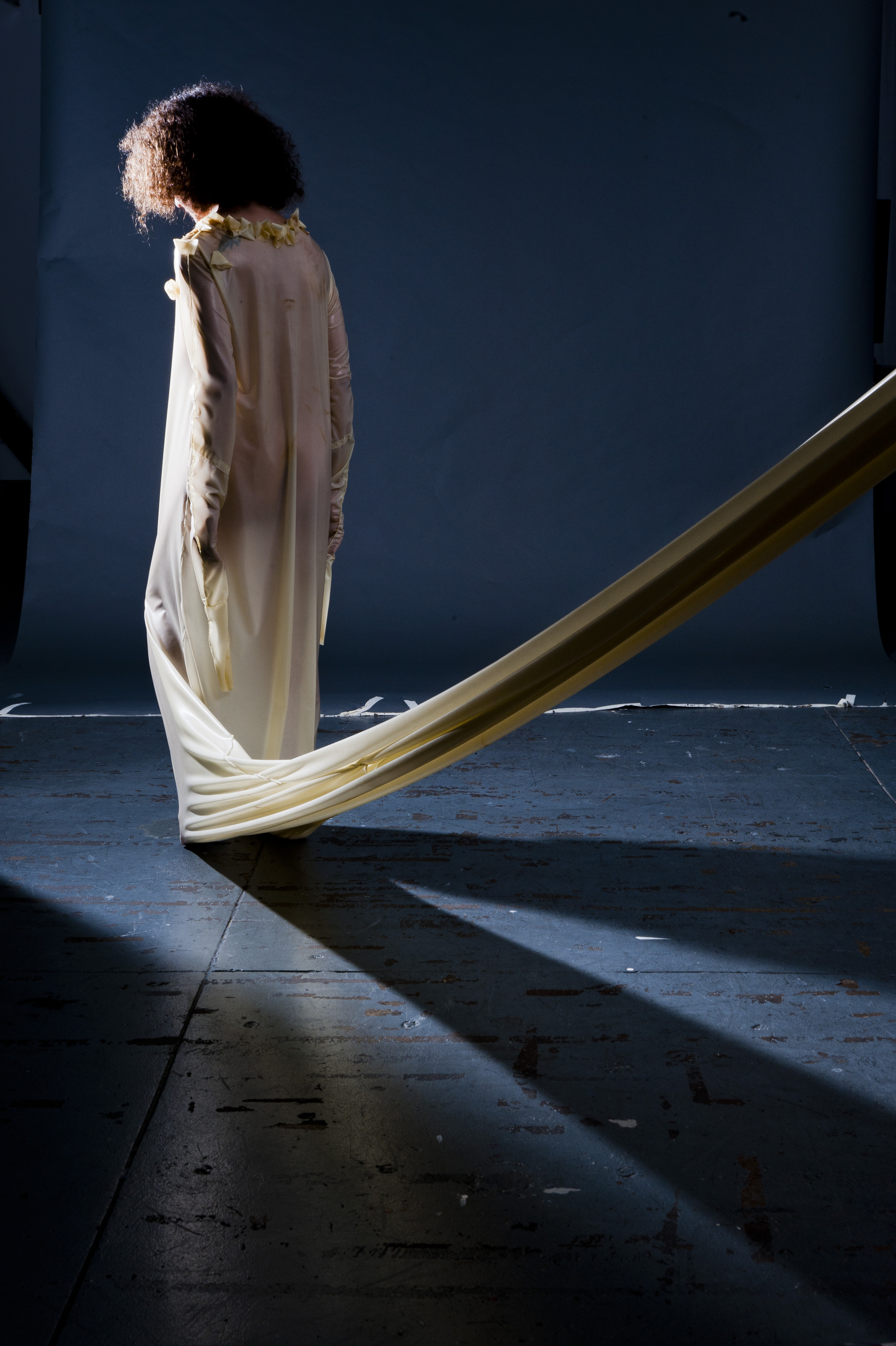 Latex dress sewed by hand for 100 hours within 10 days, partly burnd. The dress is one piece of 7 meters long material, 2 dresses in one piece. One side is empty and the other side is worn by me.